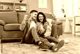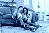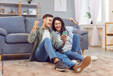 Happy excited young couple with smartphone, husband and wife relax on floor in living room feel euphoric, win lottery online cellphone, overjoyed with good unexpected news on smartphone gadget at home