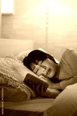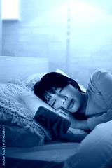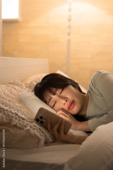 スマホを見ながら寝落ちしてしまった女性 黄色い間接照明