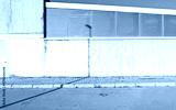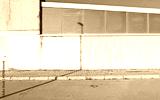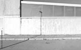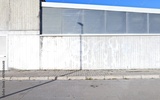 Industrial building made of concrete and metal at the roadside. Cement tiled sidewalk and street in front. Background for copy space.