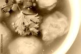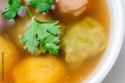 A close-up of flavorful dumplings in a clear broth, garnished with fresh cilantro. The soup features a mix of colors and textures, inviting a warm and comforting dining experience.