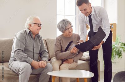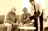 Gray-haired confident senior couple sitting on sofa in the living room at home and having consultation with a male financial advisor about health insurance. Investment in retirement concept
