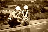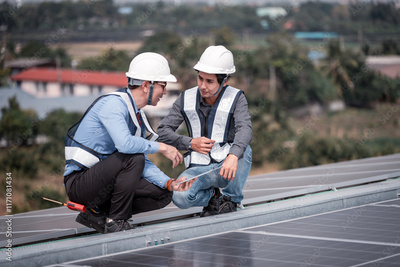 Engineers walking on roof inspect and check solar cell panel by hold equipment box and radio communication ,solar cell is smart grid ecology energy sunlight alternative power factory concept