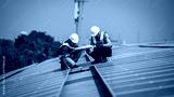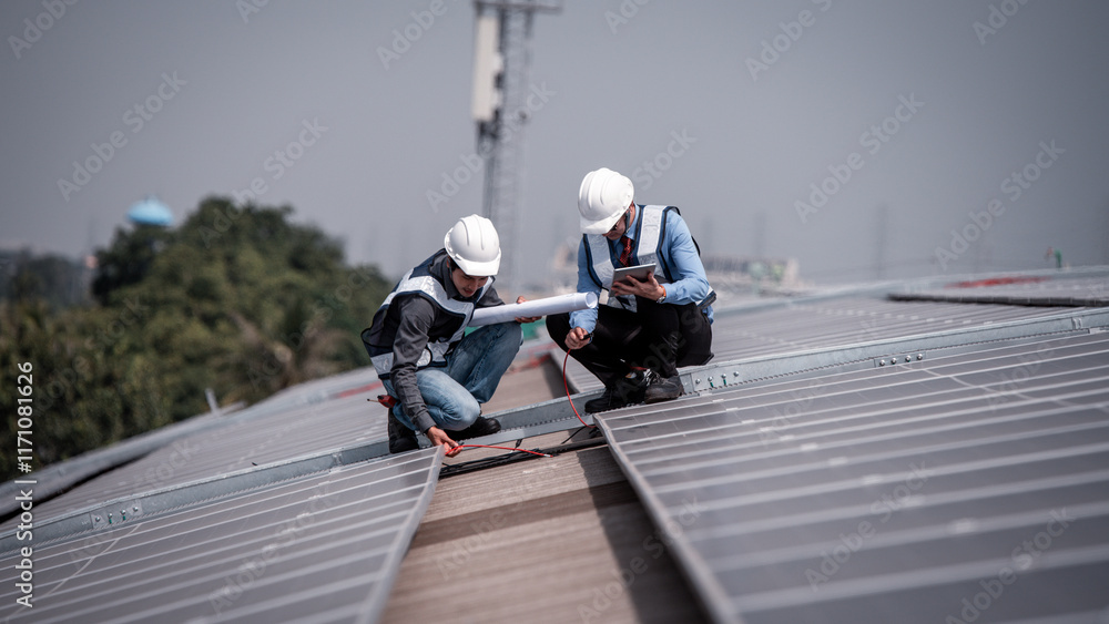 Engineers walking on roof inspect and check solar cell panel by hold equipment box and radio communication ,solar cell is smart grid ecology energy sunlight alternative power factory concept