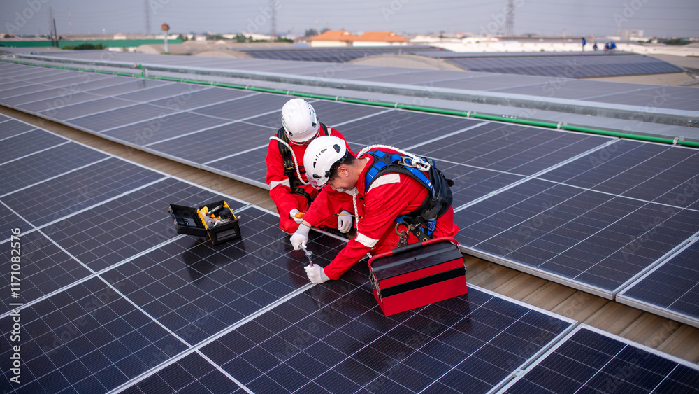 Engineers walking on roof inspect and check solar cell panel by hold equipment box and radio communication ,solar cell is smart grid ecology energy sunlight alternative power factory concept