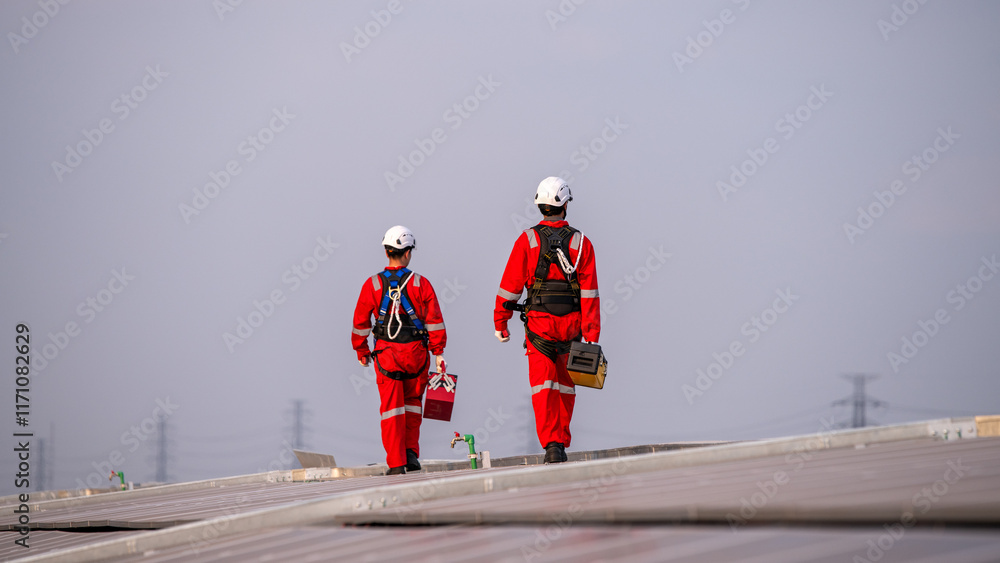 Engineers walking on roof inspect and check solar cell panel by hold equipment box and radio communication ,solar cell is smart grid ecology energy sunlight alternative power factory concept