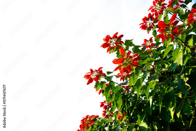 Blooming poinsettia bush isolated on white background in Mai Chau, Hoa Binh, Vietnam, tropical flowers well known for red green foliage widely used in Christmas floral displays, perennial plant