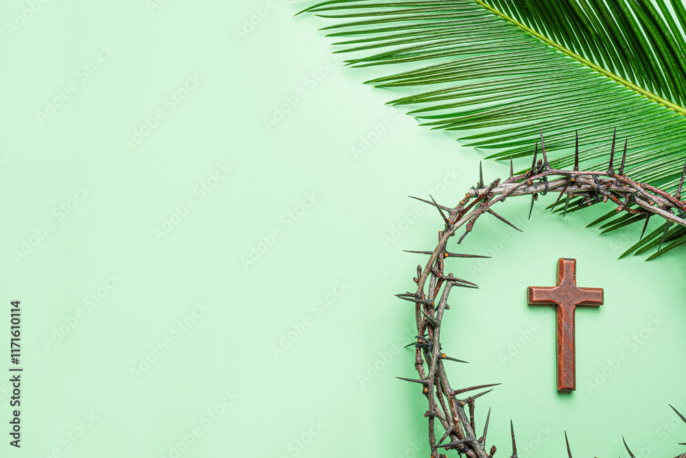 Palm Sunday. Thorn crown, wooden cross and palm leaf