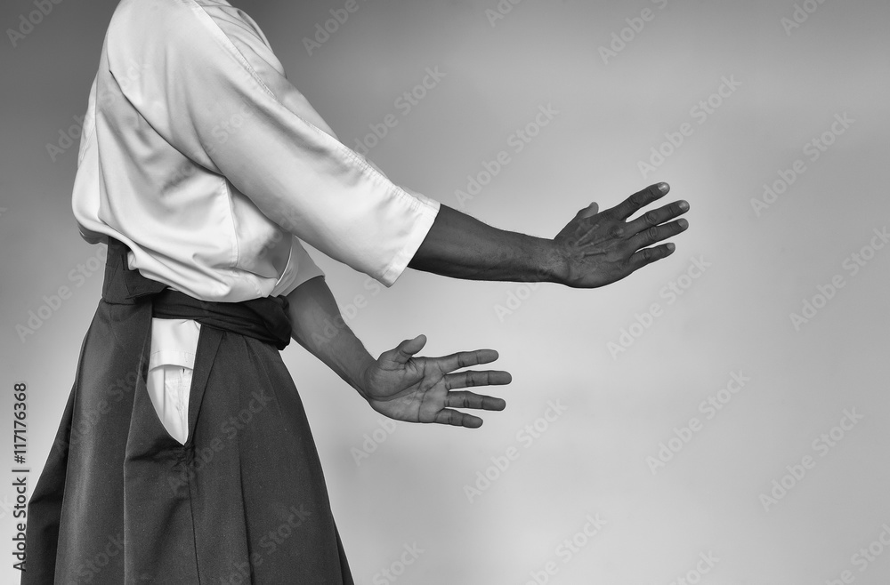 Martial arts Master in black hakama standing in combat stance. Black and white toning