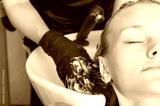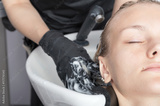 Beautiful blonde female client coloring hair in hairdressing salon