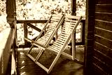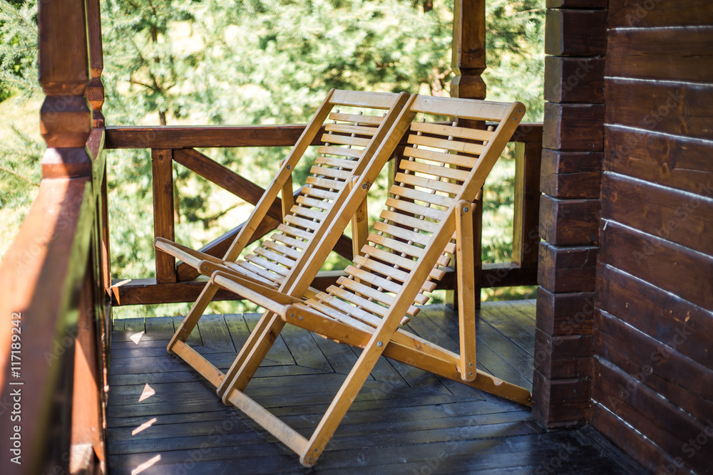 Two empty wooden chairs standing on wooden porch of rustic house at beautiful green trees nature background.