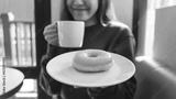 Closeup of a young woman holding and drinking hot coffee and eating donut in cafe