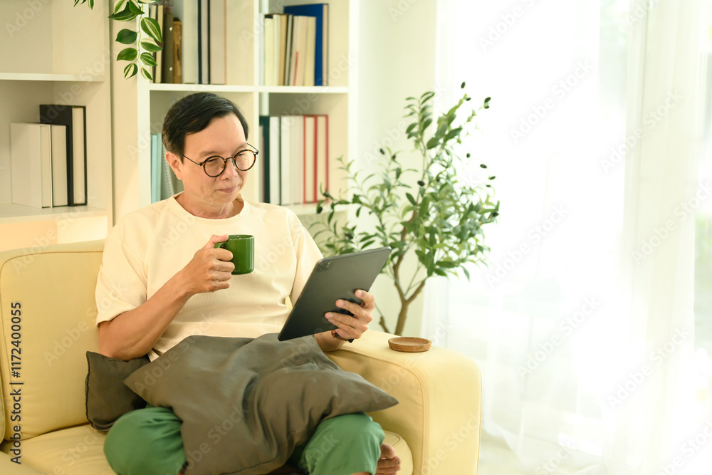 Happy senior man sipping coffee from a green mug and browsing on digital tablet