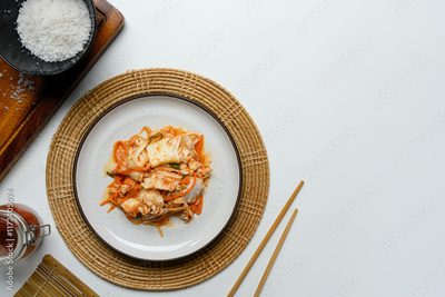 Traditional Kimchi dish placed on a rustic woven placemat surrounded by essential ingredients