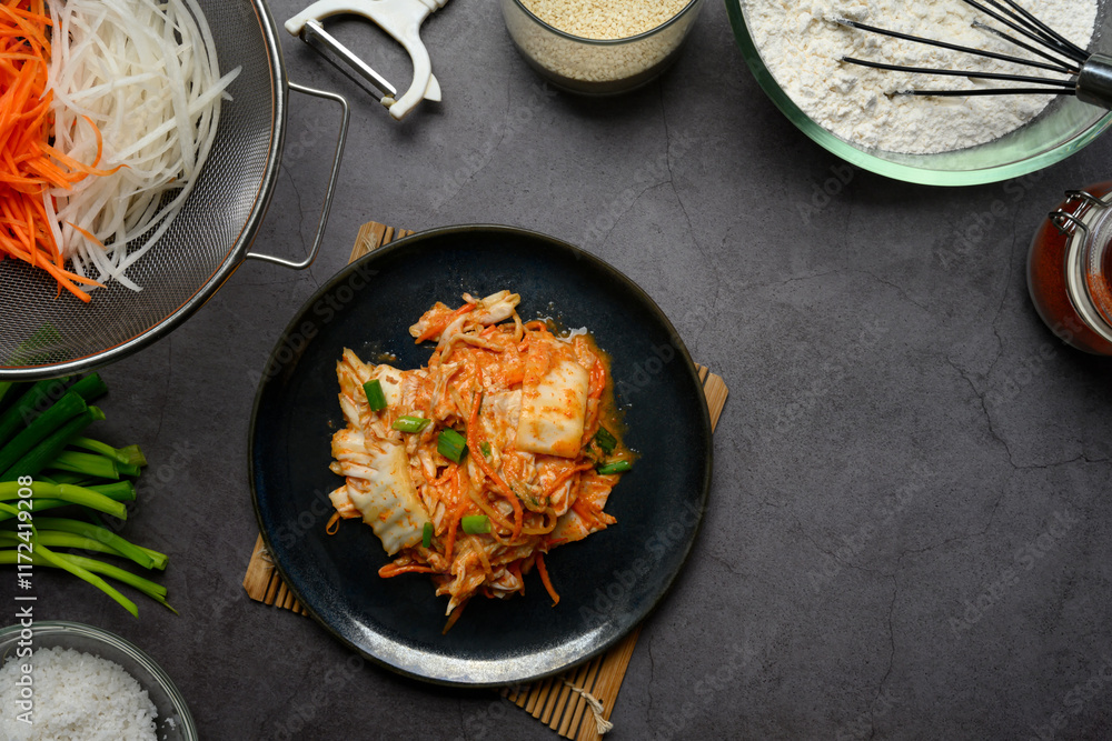 Top view traditional Korean Kimchi served on a plate. Korean cuisine and traditional side dish concept