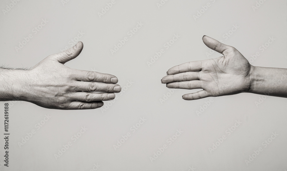 Solidarity, compassion, charity, rescue. Hands man and woman reaching to each other, support. Black and white