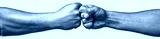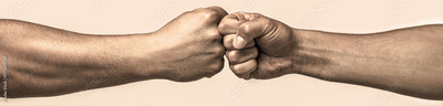 Mans are fist bumping. Fist bump. Clash of two fists, vs. Gesture of giving respect or approval. Partnership concept