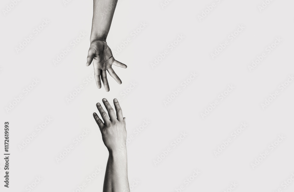 Closeup two hands reaching to each other. Concept for salvation, rescue, friendship, guidance, help, helping. Black and white