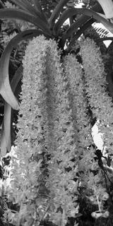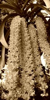 an orchid with purple and white patterns in bloom taken from the top of the tree
