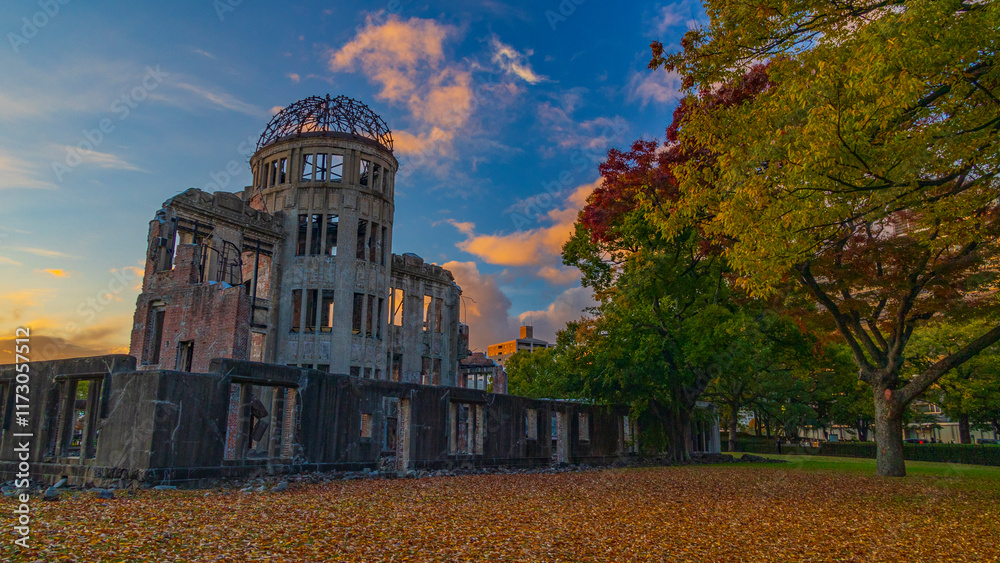 紅葉と夕焼けと原爆ドーム 秋の広島