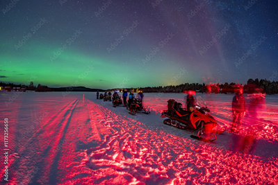 Snowmobile expedition Aurora Northern Lights in Lapland Inari Nellin Lake forest