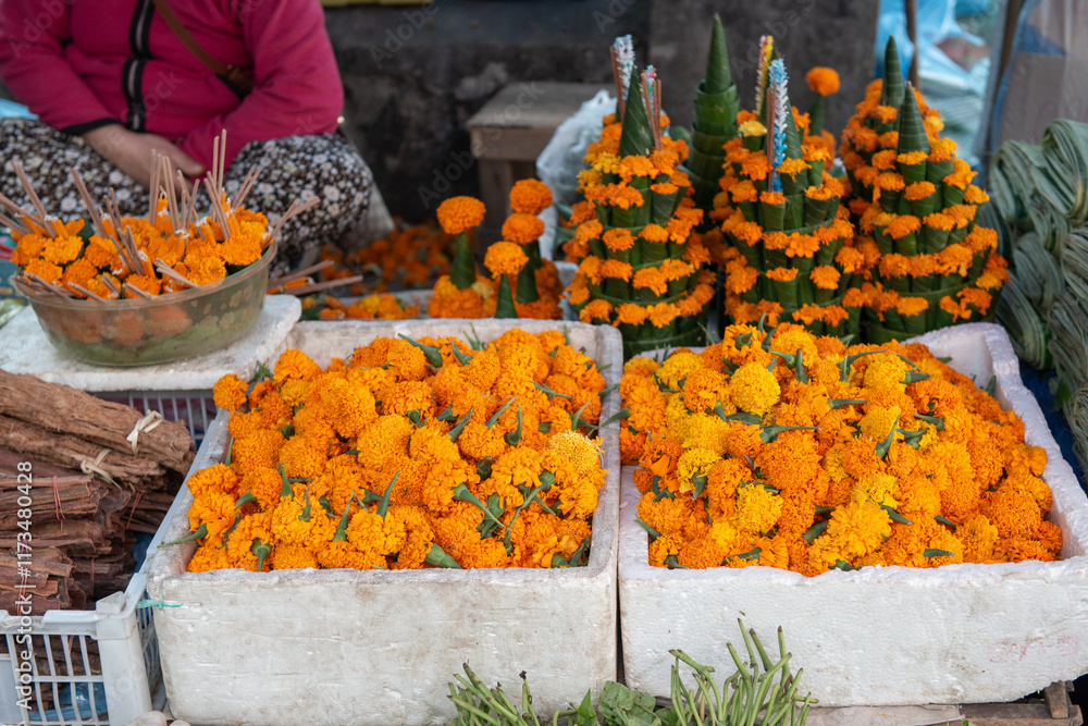 Marigold flowers sell in local market in Luang Prabang, Laos. This flower symbolizing the ephemeral nature of life and the connection between the living and the dead.