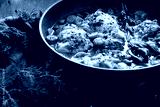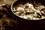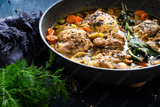 Braised chicken thighs with vegetables and sauge in frying pan on black table