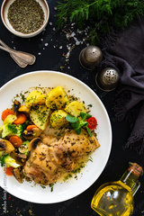 Braised chicken thighs with vegetables and boiled potatoes in sauce on black table