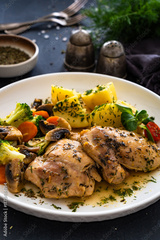 Braised chicken thighs with vegetables and boiled potatoes in sauce on black table