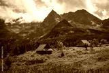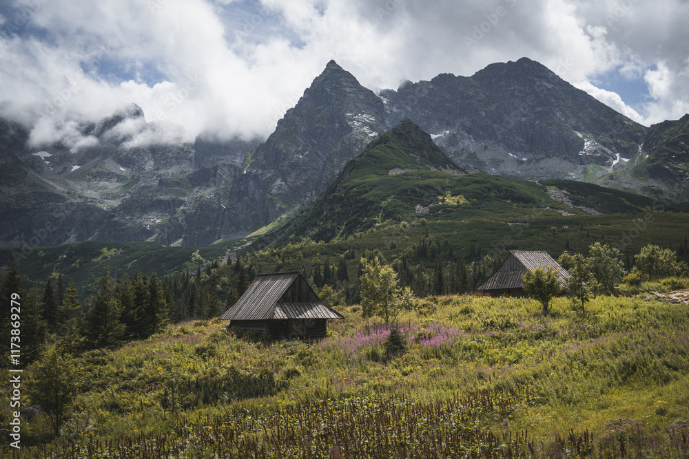 Szałąsy pasterskie na Hali Gąsienicowej w tle tatrzańskie szczyty