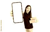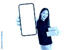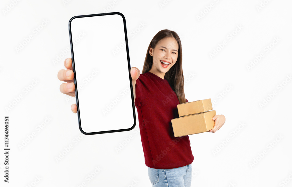 Smiling beautiful Asian woman holding cardboard boxes and hands show smartphone mockup of blank screen on white background. Take your screen to put on advertising. Concept delivery online.