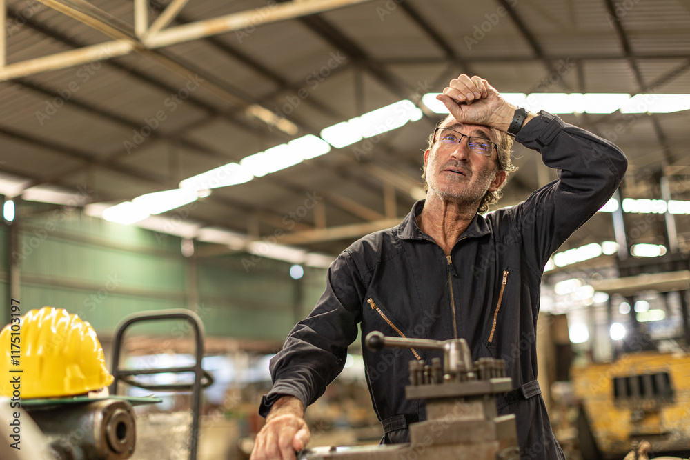 Senior worker tired exhausted headache pain suffer from hard work in heavy industry factory.