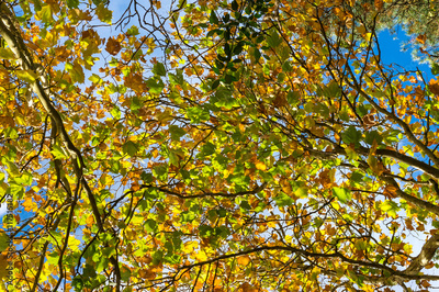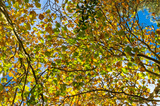 Autumn golden yellow canadian maple leaves background. Bright fall foliage wallpaper. Selective focus and shallow DOF