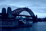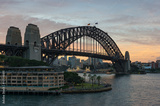 Circular Quay and Harbour Bridge with view of North Sydney and sunset sky on the background