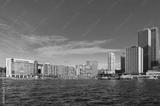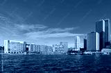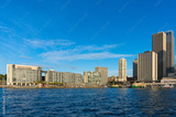 Modern skyscrapers with railway, train station and ferry wharfs against blue sky on the background. Circular Quay, Sydney, Australia