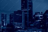 Modern cityscape at evening background. Skyscrapers of Sydney downtown at blue hour. Copy space, long exposure