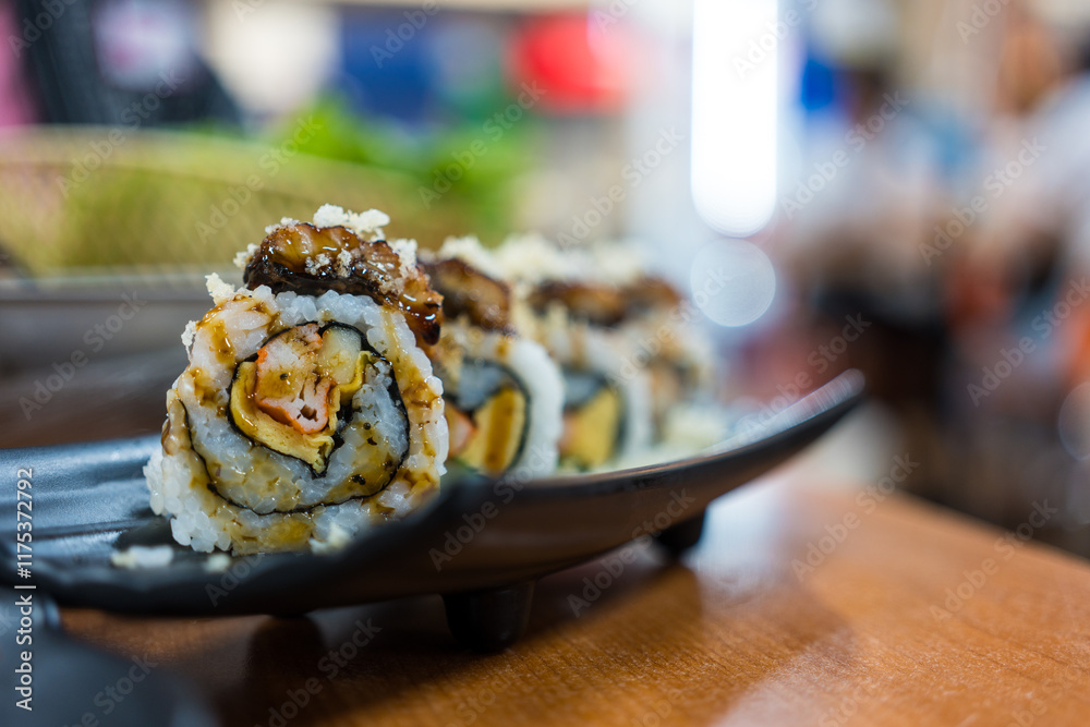 Side view of delicious sushi roll pieces on top with eel. This is a delicious sushi roll