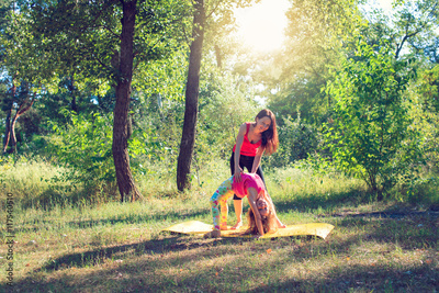 family workout - mother and daughter doing exercises on beach.