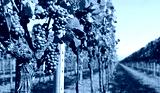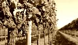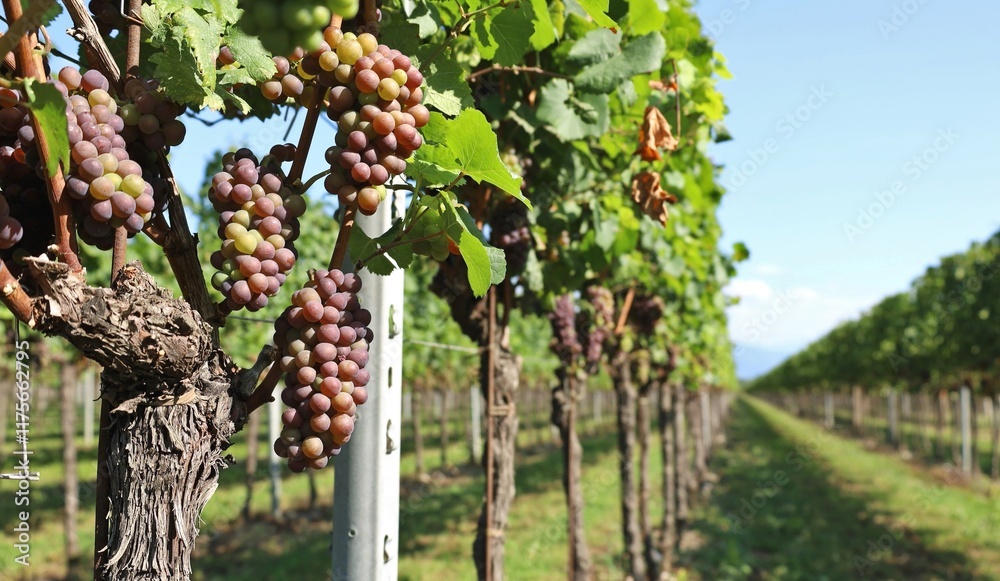 Pinot gris grapes ripening on vine at the beginning of a long row of vineyard.