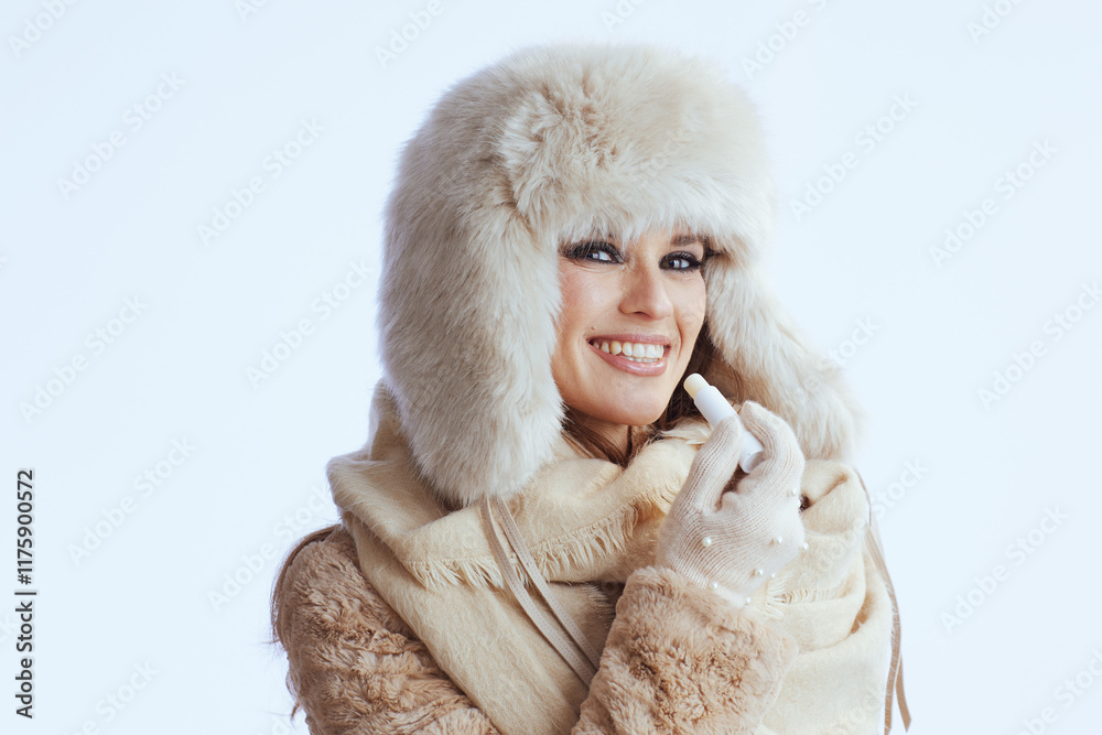 smiling modern woman in winter coat and fur hat on white