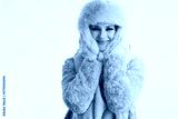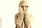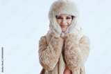 smiling modern woman in winter coat and fur hat on white