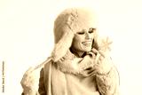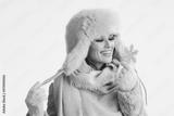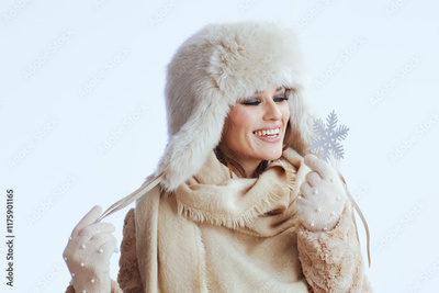 smiling stylish woman in winter coat and fur hat on white