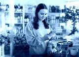 Teenage girl buyer with mobile phone choosing food in grocery store