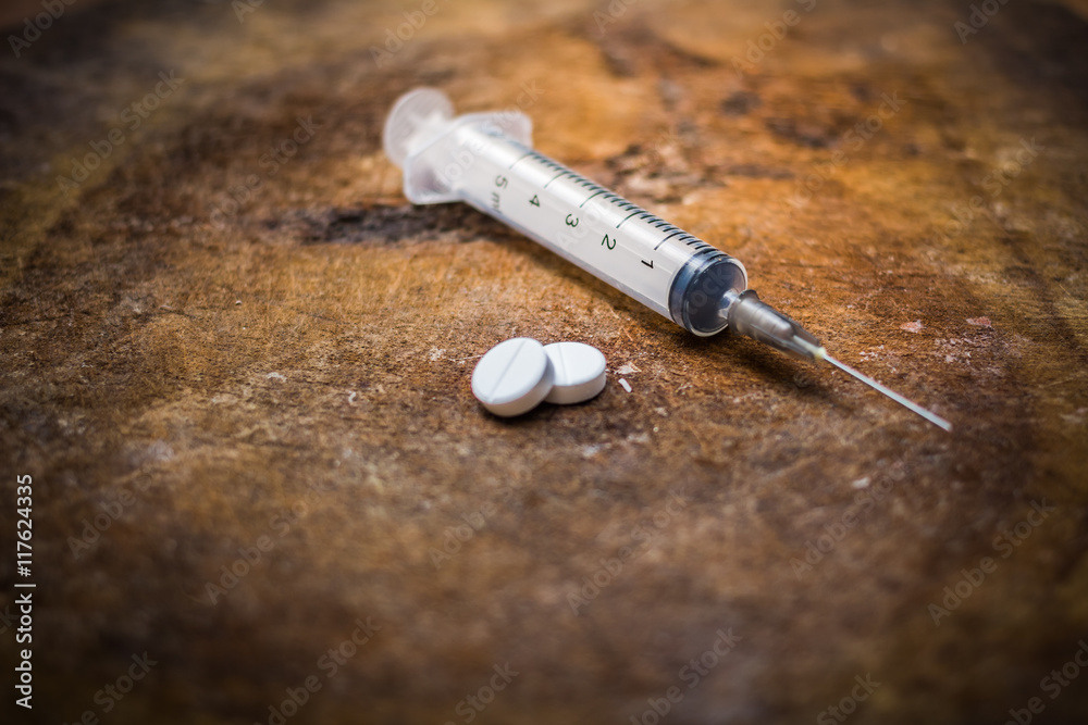 Syringe and heroin on wooden background with shadow edge. Drug a