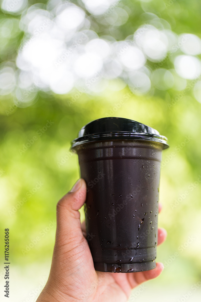 Closeup of man hand holding a plastic cup of iced black coffee with nature background.