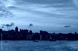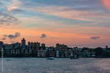 Cityscape with dramatic colorful evening sky on the background. Modern waterfront buildings of Kirribilli suburb of North Sydney, Australia. Urban sunset landscape with space for text
