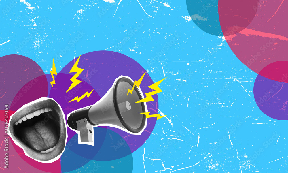 Modern art collage with Colorful Abstract Artwork Featuring a Loudspeaker and Vibrant Background Graphics