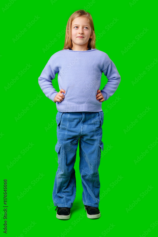 Child wearing a blue sweater and light blue pants stands confidently in front of a green background