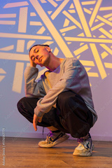 A young man sits with his legs crossed in a squat, with a projection of white lines and shapes behind him