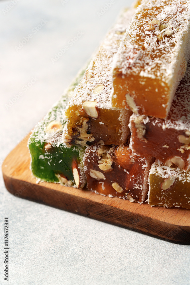 Turkish delight confectionery assortment with nuts and coconut on wooden serving board