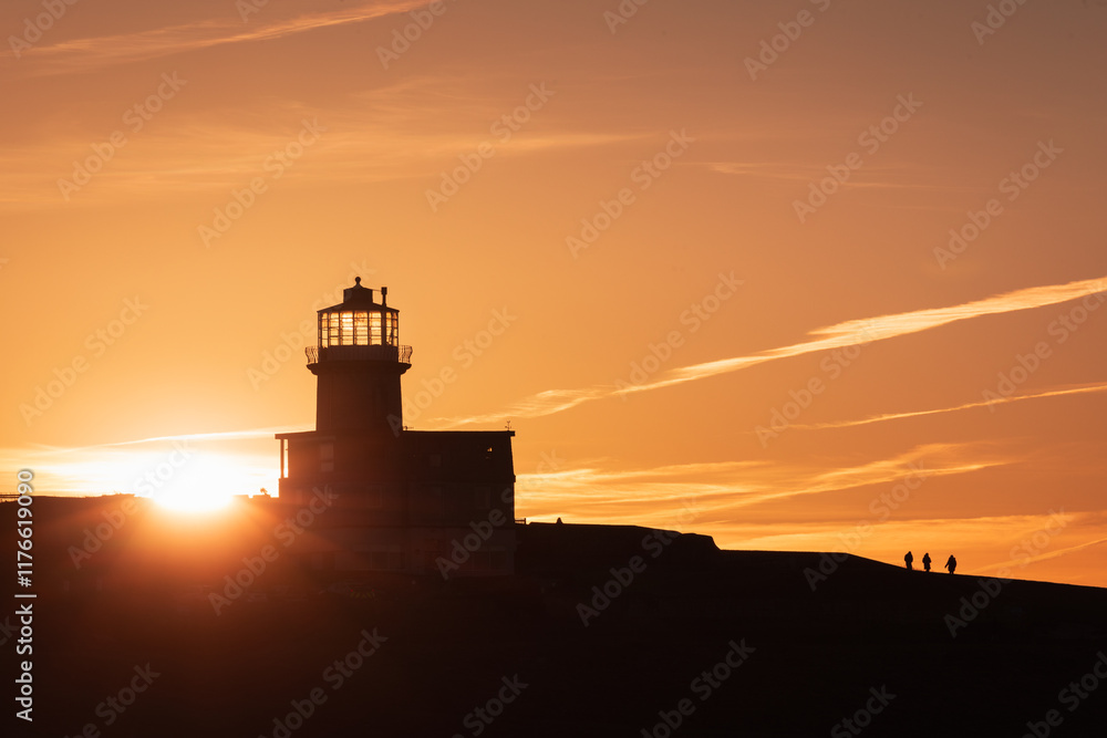 Vivid January sunset behind Belle Tout Lighthouse Beachy Head on the east Sussex coast south east England UK